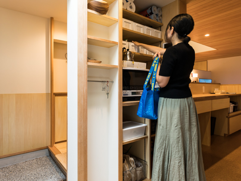 奥様 とても満足しています。私たち、野村建設さんにおまかせで、ご提案いただいた図面からほとんど何も変更していないのですが、住むほどに細部まで練られた設計であることに気づかされます。たとえば、玄関ホールから直接入ることもできるパントリー。重い荷物を抱えてわざわざLDKを回りこまなくても済むので、買い物帰りは特に便利!よく見ると、出入り扉の上部に明かり取りのスペースが作ってあって、そういうところも気が利いているんですよね。収納も適材適所にたっぷりあるから掃除がラク。とにかく心地よく、動きやすくてスッキリ片付く、そんな住まいです。