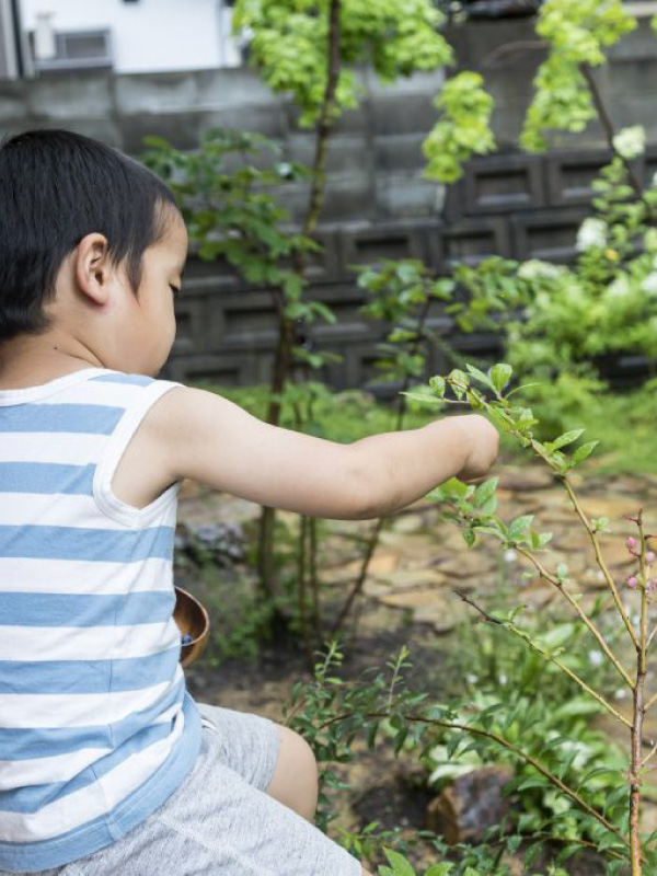 奥様 あの日、造園家の荻野寿也先生が「子どもたちにぜひ、自分で選んだ苗木を自分の手で庭に植える経験をさせてほしい」とおっしゃったでしょう。すぐに園芸店に行って、実践しました。以来、お庭も大切にしようという意識が家族の中でより強くなったように感じます。今の季節は、ブルーベリー収穫が子どもたちの朝の日課。お庭のある暮らしを自然な形で楽しめています。
