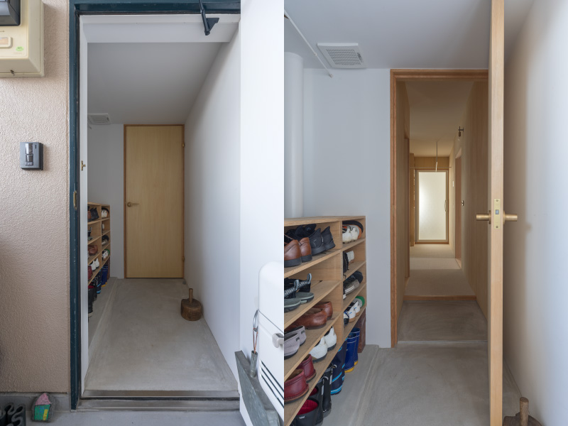 井上(明) 今回のリノベーションのポイントは断熱改修でした。いったんスケルトン(※建物の枠組みだけを残した状態に解体すること)にしてウレタン吹付断熱材を施工し、窓は二重に。玄関ドアはマンション全戸で統一されていて変えられないので、断熱材入りの造作扉を内玄関ドアという形で設置させていただきました。