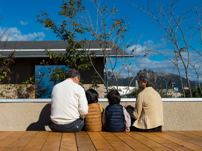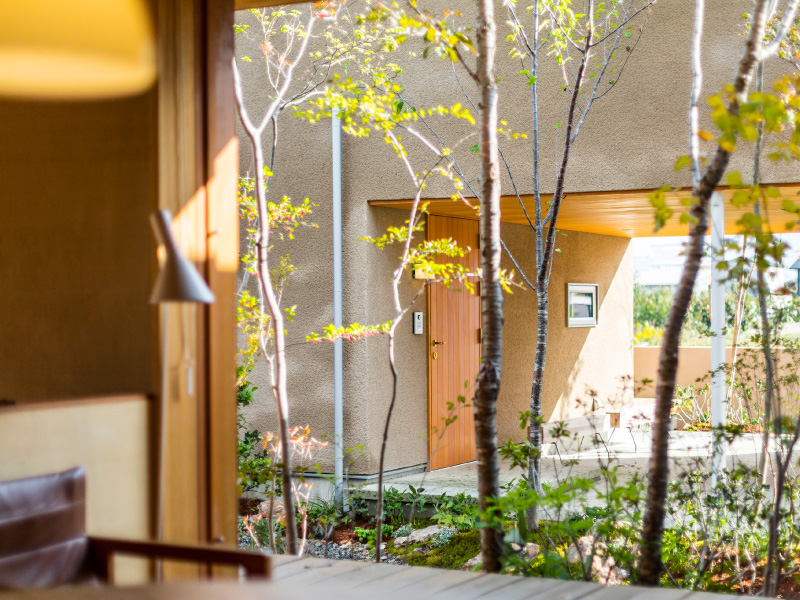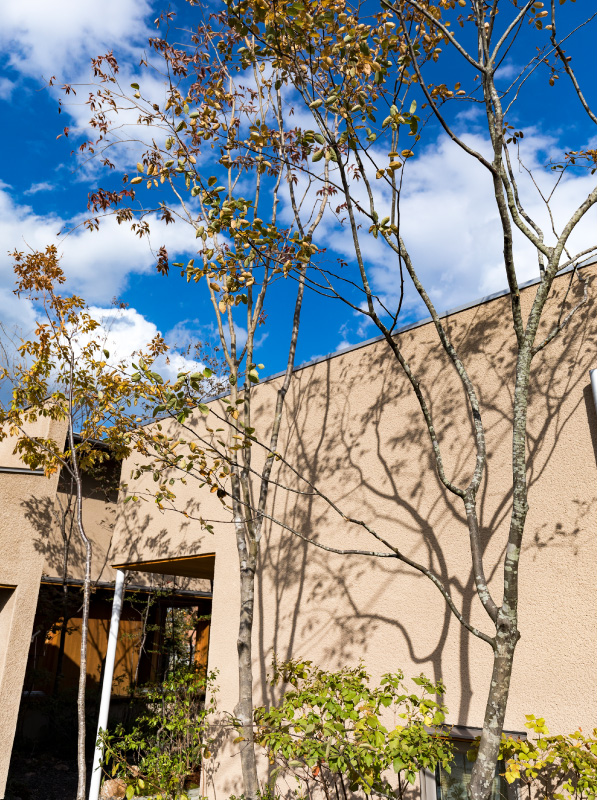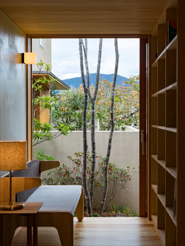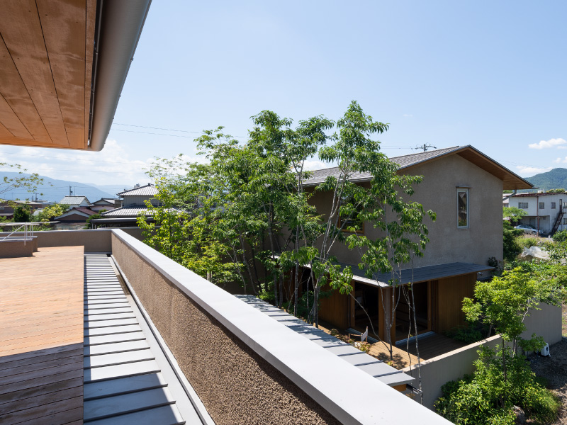 荻野寿也氏(以下、荻野氏) ありがたいお言葉ですね。「くらしこの家」は中庭がポイントになっているのですが、今回ハナレが完成してアプローチが豊かになったぶん、奥行きが生まれて、全体的なバランスがより良くなったと思います。伊礼さんの建築は、その場所ならではの景色のいいところを切り取って開口部を設計されるので、植栽が入れやすいんですよ。「くらしこの家」の場合は、柿畑の風景や遠くに望む山の稜線が美しい。それらの眺めを邪魔しないような植栽を考えて、山桜やアオダモなどの花が咲く高木を入れました。春になったらぜひ、屋上テラスでお花見を楽しんでいただきたいです。